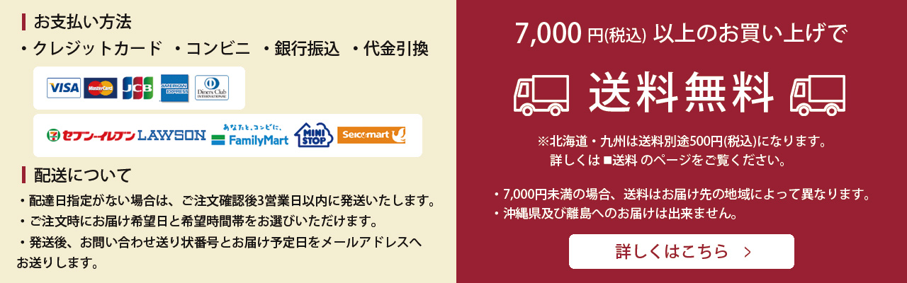 ・お買い上げ合計7,000円(税込)以上で送料無料(北海道・九州は送料別途500円となります。)